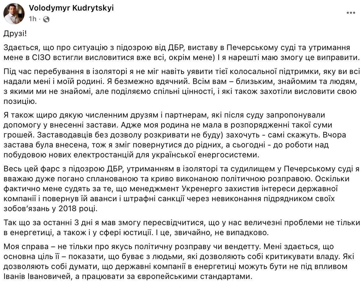 Колишній очільник "Укренерго" Володимир Кудрицький, який напередодні вийшов із СІЗО під заставу, вважає справу проти себе "дуже погано спланованою та криво виконаною політичною розправою".