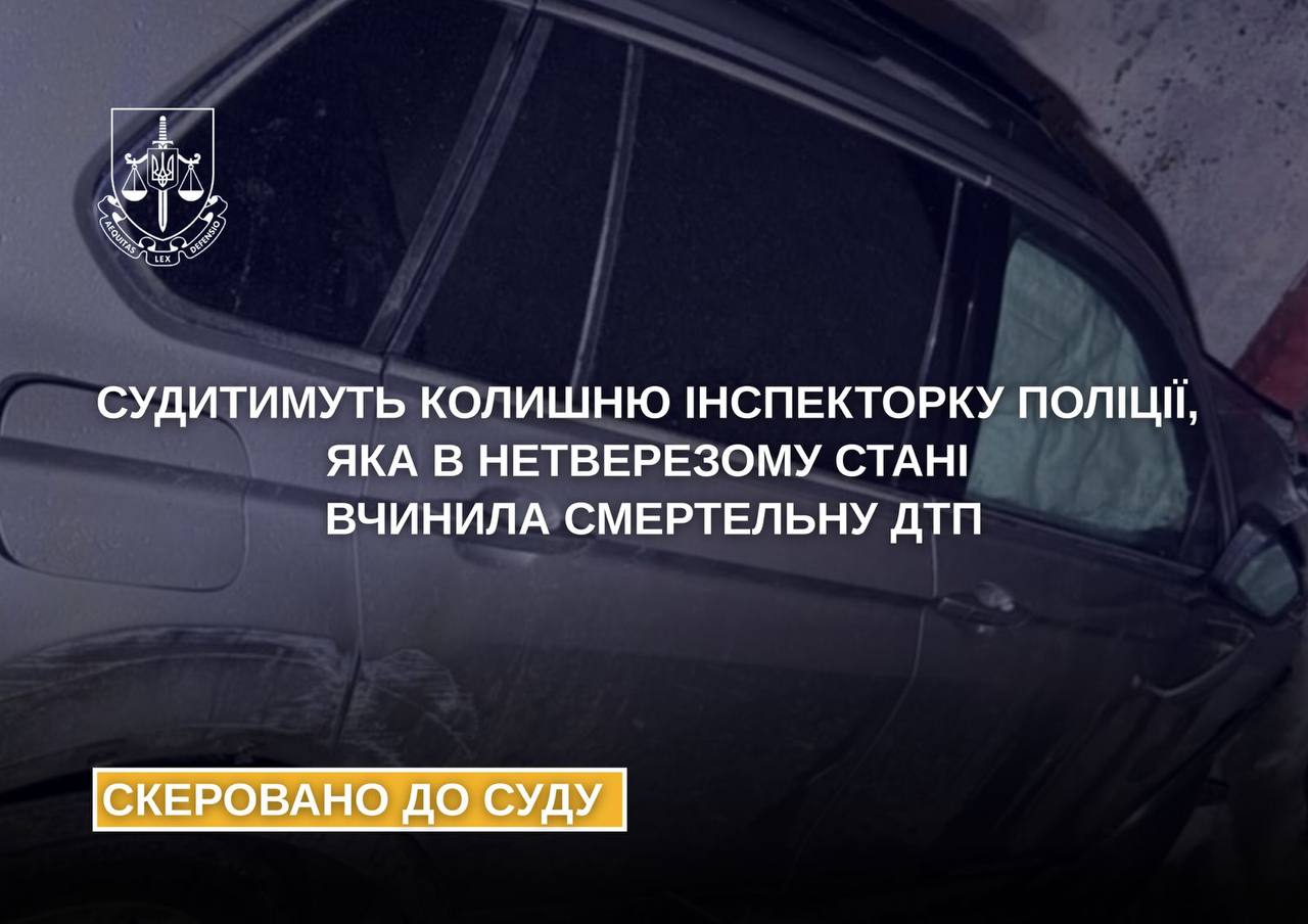 Прокурори Чернівецької обласної прокуратури скерували до суду обвинувальний акт стосовно колишньої інспекторки сектору реагування Чернівецького районного управління поліції, яка, керуючи автомобілем у стані алкогольного сп'яніння, порушила правила дорожнього руху та спричинила смертельну ДТП.
