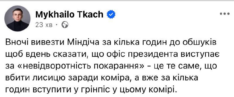 "Вночі вивезти Міндіча за кілька годин до обшуків щоб вдень сказати, що Офіс президента виступає за "невідворотність покарання" - це те саме, що вбити лисицю заради коміра, а вже за кілька годин вступити у Greenpeace у цьому комірі", - заявив журналіст.