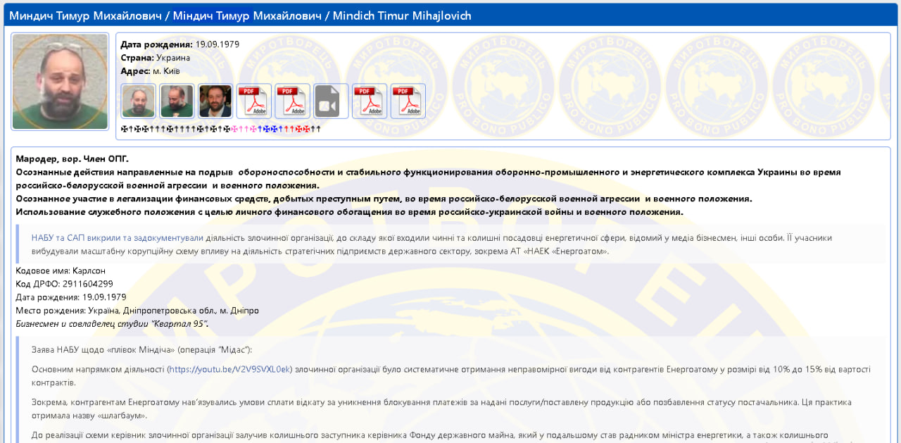 Зазначається, що Тимур Міндіч причетний до підриву стабільності оборонно-промислового та енергетичного комплексу, а також до використання службового становища для особистого збагачення.