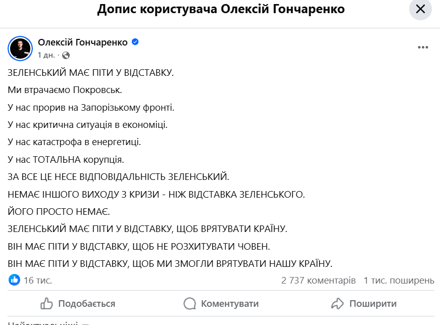 "ЗЕЛЕНСЬКИЙ МАЄ ПІТИ У ВІДСТАВКУ. Ми втрачаємо Покровськ. У нас прорив на Запорізькому фронті. У нас критична ситуація в економіці. У нас катастрофа в енергетиці. У нас ТОТАЛЬНА корупція", - пише він.