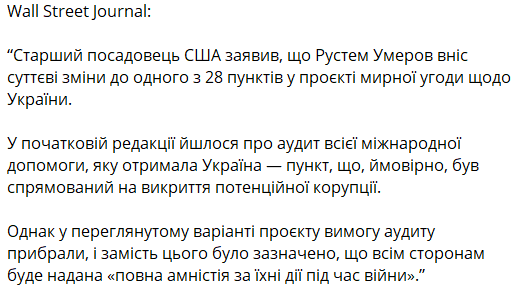 - Також агентство Reuters писало, що Україна отримала від Сполучених Штатів низку сигналів щодо пропозицій по угоді про припинення війни. Київ участі в обговоренні не брав.