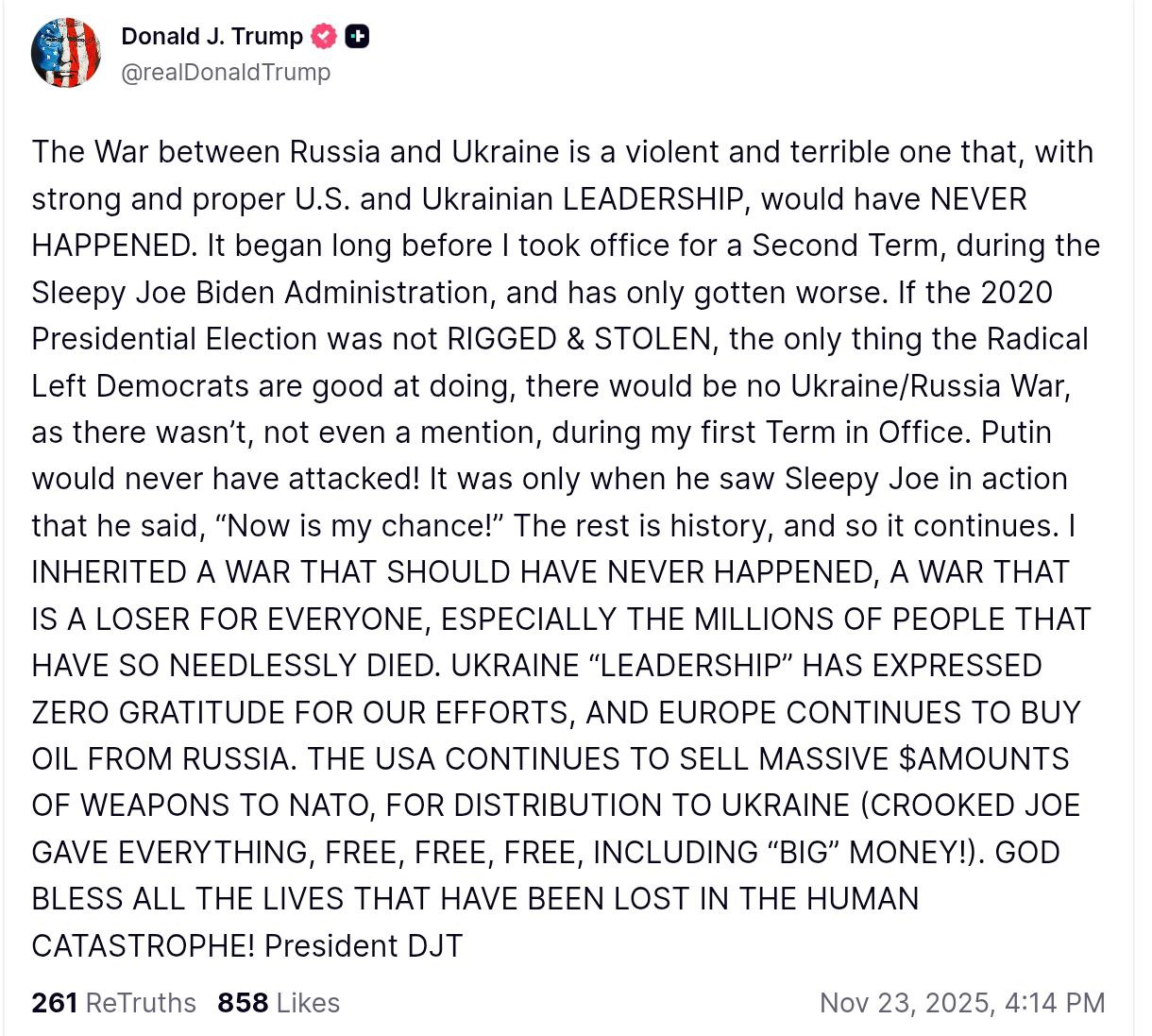 После цунами критики Плана Трампа в Европе, в самих США, и в Украине Трамп перешел к нападению и оправданию себя - мол, "Это не моя война, я хоть что-то пытаюсь сделать, Зеленский - козел, Европа - лицемеры.