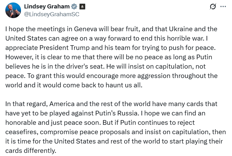 Грем висловив сподівання, що зустріч в Женеві принесе плоди, і Україна та США зможуть домовитися про подальший шлях для припинення війни.
