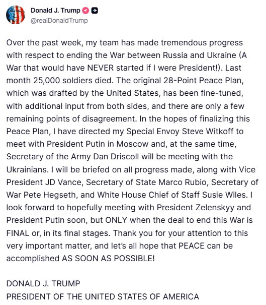 "Протягом останнього тижня моя команда досягла значного прогресу в питанні припинення війни між Росією та Україною (війни, яка НІКОЛИ б не почалася, якби я був президентом!). Минулого місяця загинуло 25 000 солдатів. З метою остаточного узгодження цього мирного плану я доручив своєму спеціальному посланнику Стіву Віткоффу зустрітися з президентом Путіним у Москві, а міністр армії Ден Дрісколл зустрінеться з українською стороною", - написав він.
