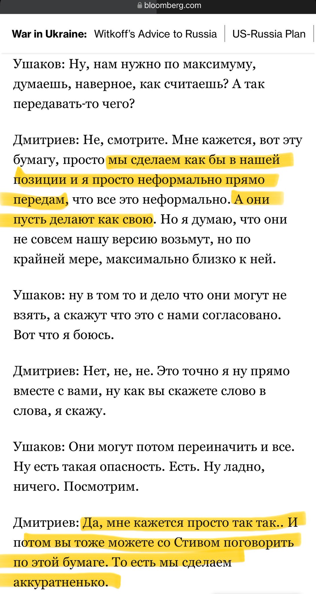 Тепер все це вже зрозуміло. Це не план "Віткоффа-дмітрієва", це не "план Трампа", це взагалі не "план". Це фсбшний папірець, який підготували під наглядом дмітрієва для капітуляції України.