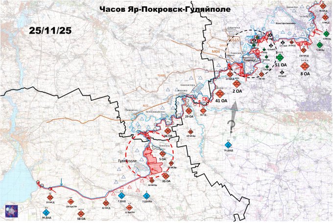 На північно-західній околиці Покровська продовжуються бої в районі промзони. У північній частині міста українські війська провели локальні контрдії у районі Динасового селища, де раніше фіксувалися сили противника.