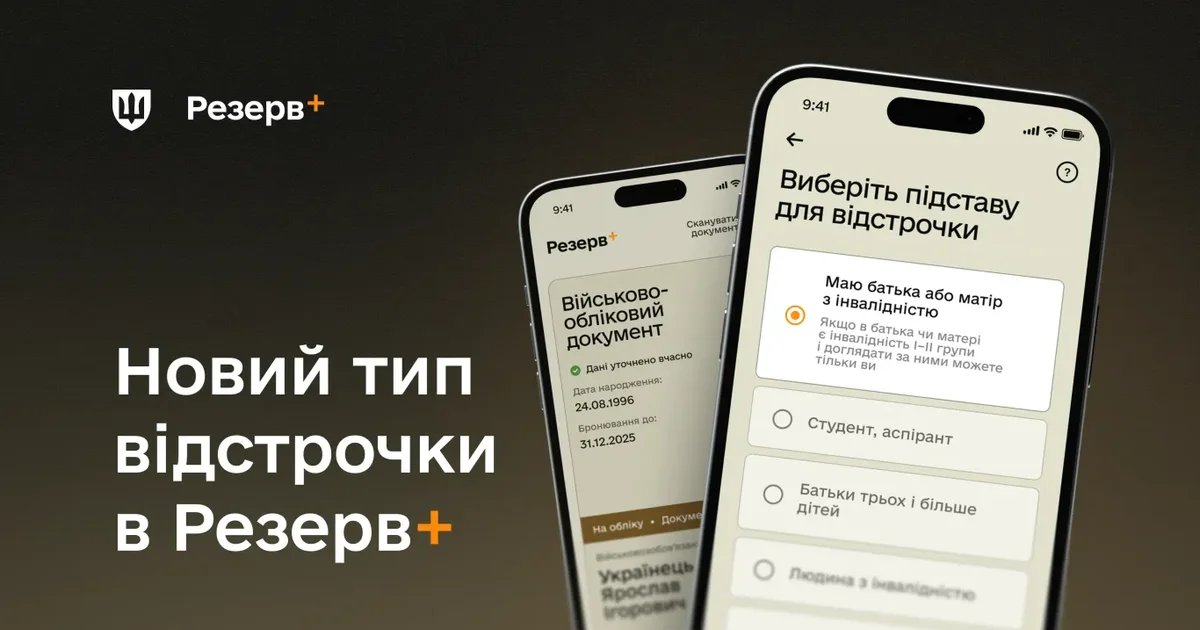 Міноборони запустило нову онлайн-відстрочку у застосунку Резерв+, яку можуть отримати військовозобов’язані, що доглядають за батьком або матір’ю з інвалідністю I чи II групи. Процес повністю автоматизований, а рішення з’являється у військово-обліковому документі за кілька хвилин чи годин.