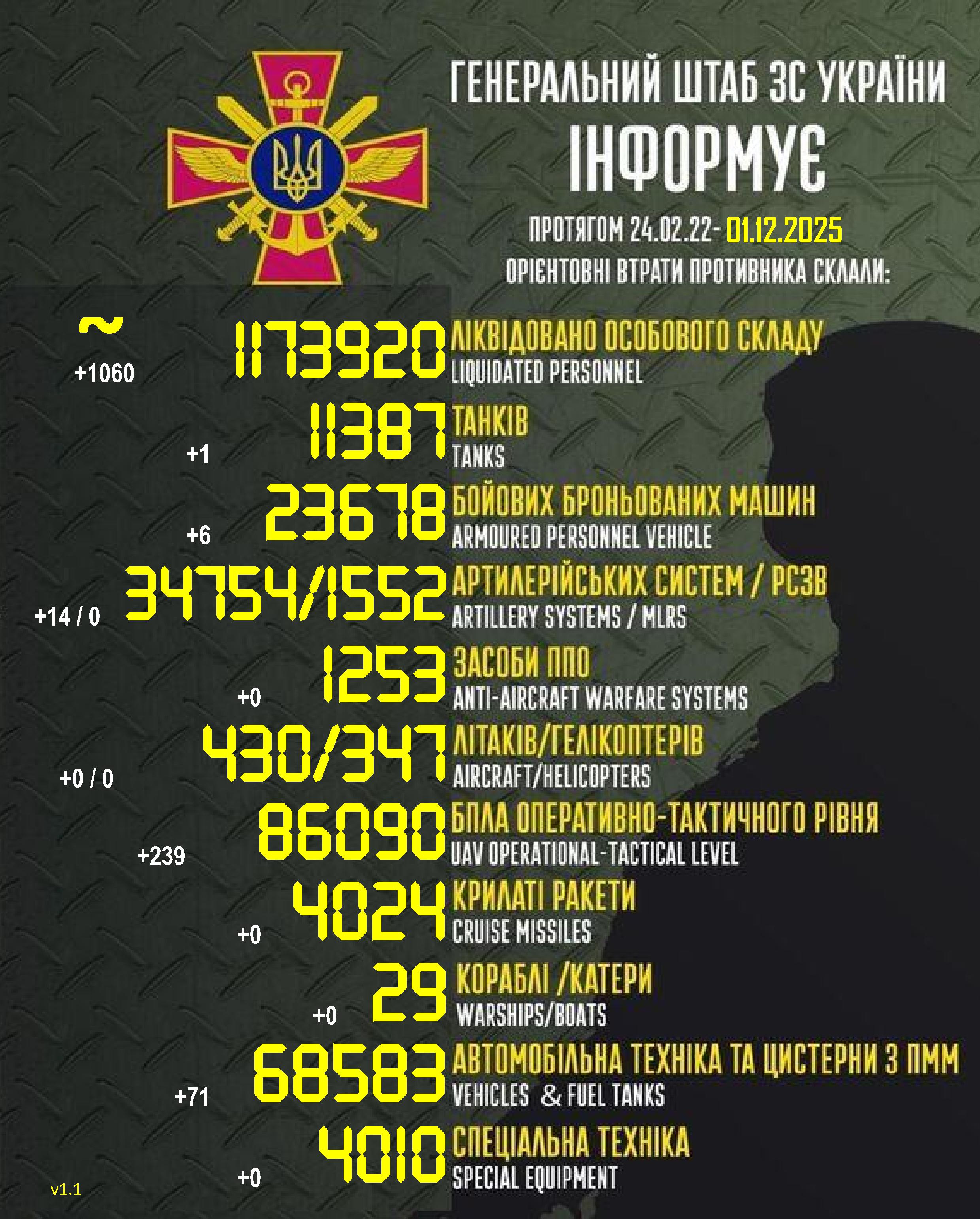 Як зазначається, загальні бойові втрати РФ із 24.02.22 по 1.12.25 орієнтовно становлять: