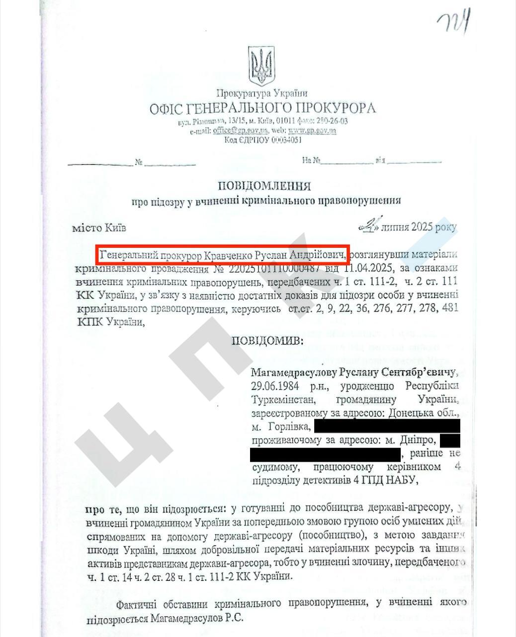 Підозру детективу НАБУ Магамедрасулову підписав особисто Генеральний прокурор Руслан Кравченко.