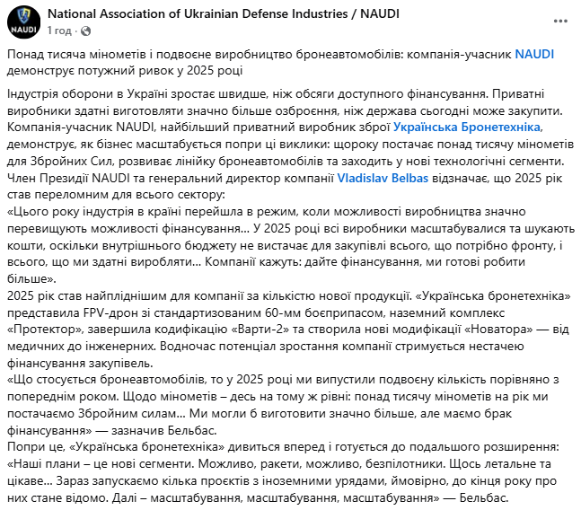 "Що стосується бронеавтомобілів, то у 2025 році ми випустили подвоєну кількість порівняно з попереднім роком. Щодо мінометів - десь на тому ж рівні: понад тисячу мінометів на рік ми постачаємо Збройним силам… Ми могли б виготовити значно більше, але маємо брак фінансування" - зазначив Бельбас.
