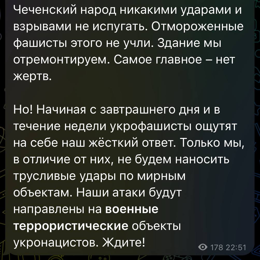 "Починаючи з завтрашнього дня і протягом тижня [українці] відчують на собі нашу жорстку відповідь... Наші атаки будуть спрямовані на військові терористичні об'єкти укронацистів. Чекайте!" - пригрозив глава Чечні, додавши, що це "особистий подарунок".