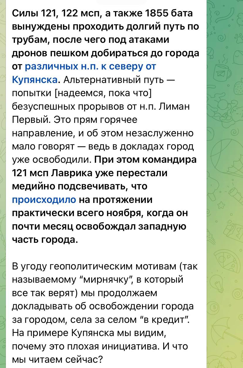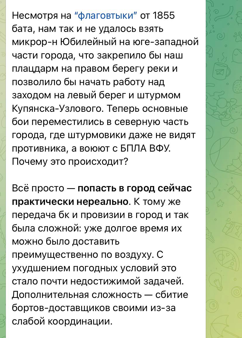 "Незважаючи на "флаговтики" від 1855 бата, нам так і не вдалося взяти мікрор-н Ювілейний в південно-західній частині міста, що закріпило б наш плацдарм на правому березі річки і дозволило б розпочати роботу над заходом на лівий берег та штурмом Куп'янська-Вузлового", - йдеться у дописі.