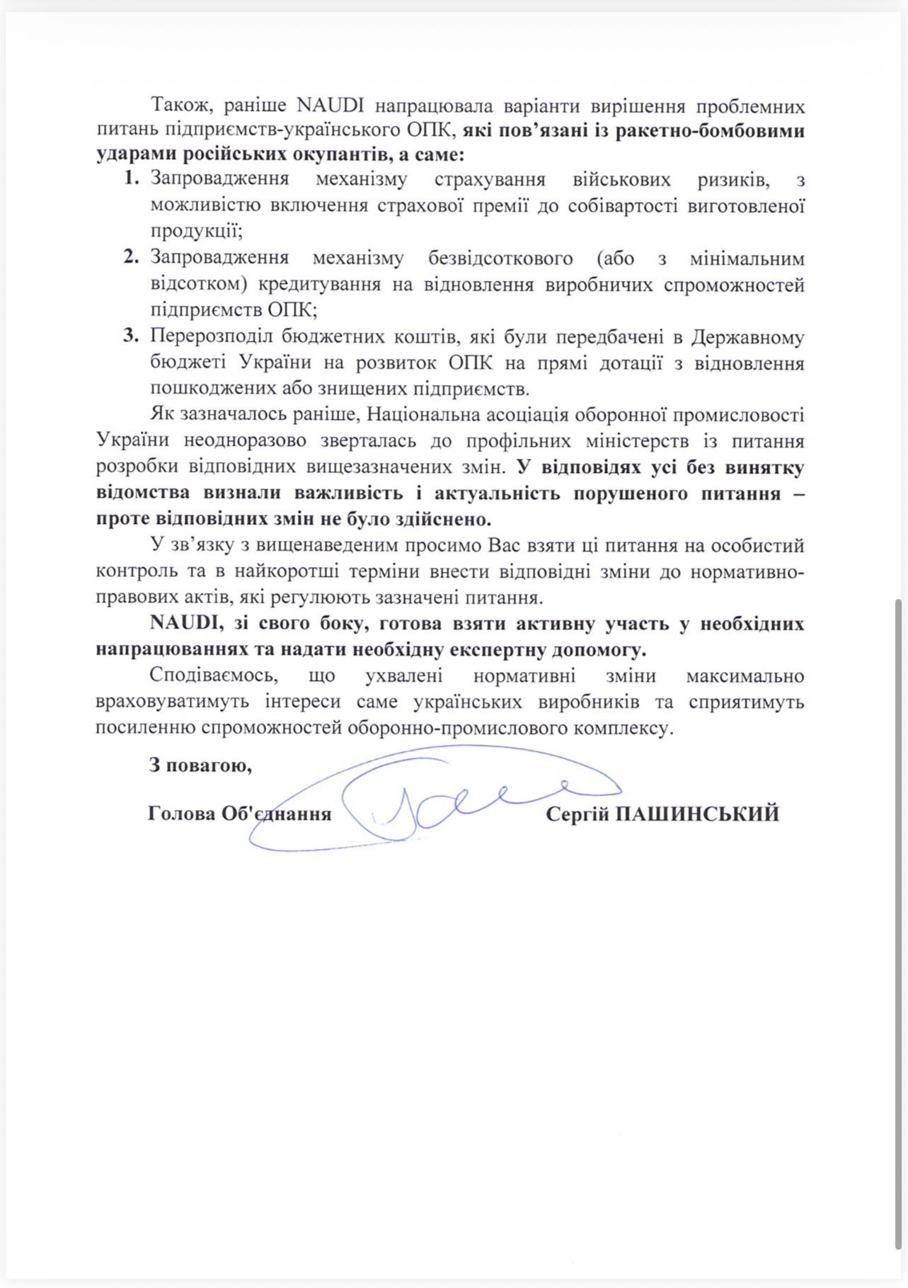 NAUDI закликала Свириденко запровадити фінансову підтримку для пошкоджених підприємств ОПК. ДОКУМЕНТ