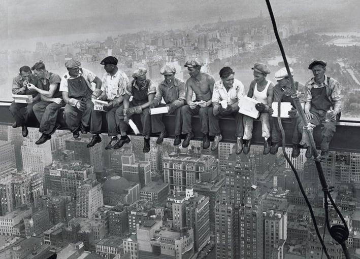 Художники зобразили їх у стилі відомої фотографії "Обід на даху хмарочоса", підкресливши поєднання людини й машини у нову епоху.