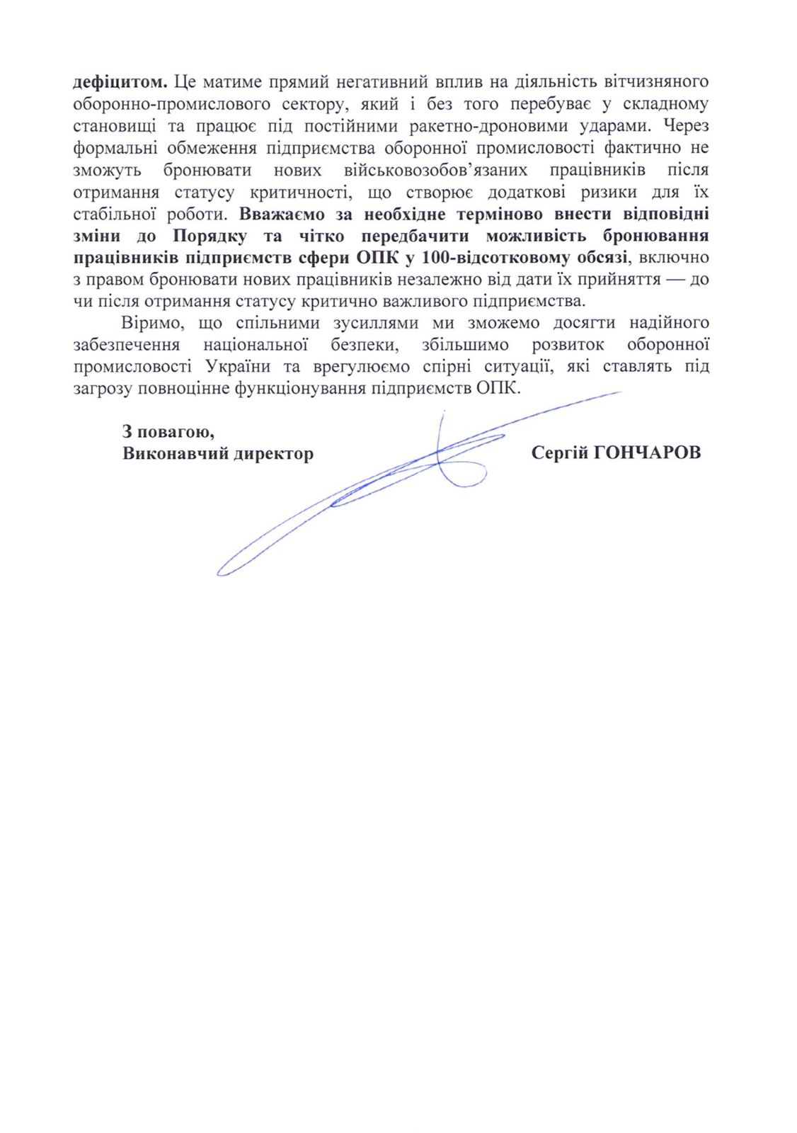 "Відповідно до чинного законодавства, підприємства оборонно-промислового комплексу, визнані критично важливими для забезпечення потреб Збройних Сил, інших військових формувань в особливий, період мають право бронювати 100% військовозобов’язаних працівників. Однак чинна редакція Порядку створила правову колізію: після отримання статусу критично важливого підприємства забронювати нових працівників фактично неможливо, оскільки за новим порядком фіксується гранична чисельність заброньованих працівників", - ідеться в повідомленні.