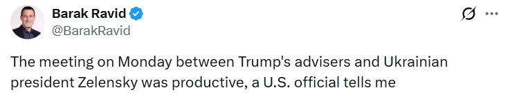 "Зустріч у понеділок між радниками Трампа та президентом України Зеленським була продуктивною", - зазначив він.
