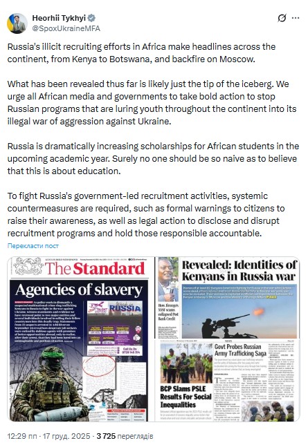 "Ми закликаємо всі африканські ЗМІ та уряди вжити рішучих заходів, щоб зупинити російські програми, які заманюють молодь по всьому континенту у свою незаконну агресивну війну проти України. Росія різко збільшує стипендії для африканських студентів у наступному навчальному році. Напевно, ніхто не повинен бути настільки наївним, щоб вважати, що це стосується освіти", - наголосив речник МЗС.