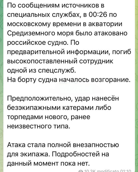 @ "Есть информация о том, что в результате внезапной атаки неизвестных подводных дронов в Средиземном море было поражено российское судно, пострадали примерно 10 человек: 7 раненых, двое погибли.