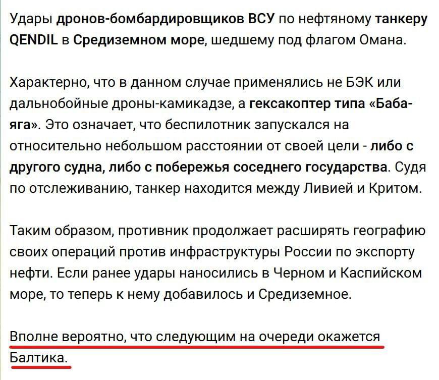 "https://t.me/nevzorovtv/30708 Судя по всему, удар по судну был осуществлен Силами Обороны с помощью дронов, стартовавших с БЭК, которые вышли из порта Греции и прошли 500 км под водой"