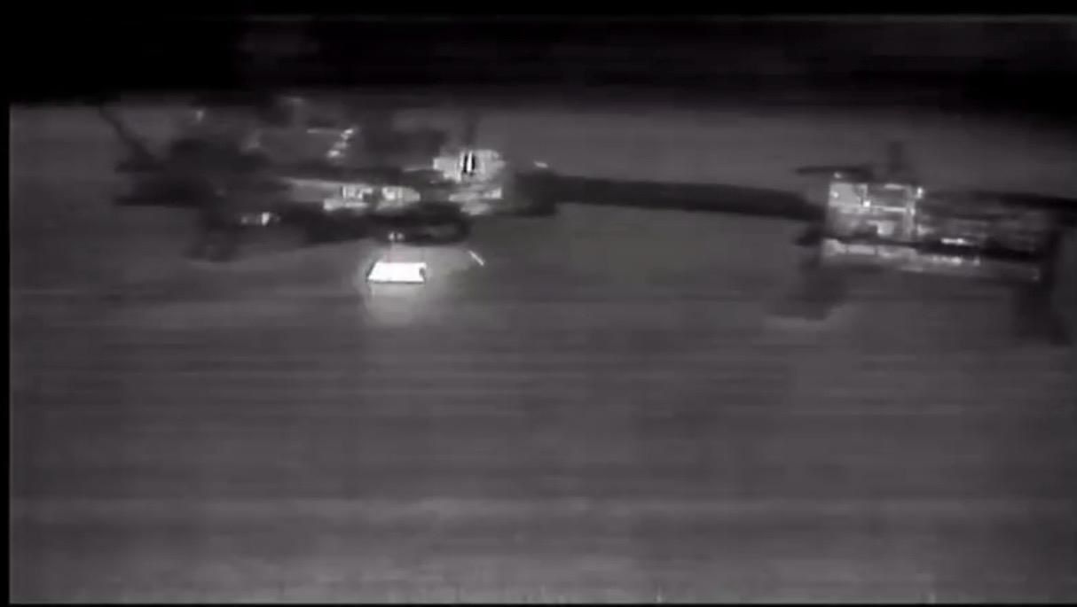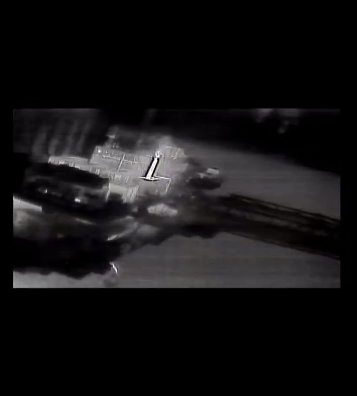 Камера БпЛА зафіксувала успішне влучання в район газотурбінної установки платформи.