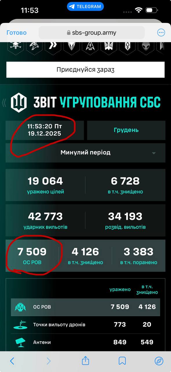 "7500 за 19 діб грудня - цифри, що мають значення. Плюс 43,7% - приріст знищення живої сили противника Птахами СБС у грудні відносно аналогічного періоду листопада (7500 істот станом на 12:00 19 грудня проти 5217 хробаків на 19 листопада) та у 2,7 рази більше, ніж у червні (2787 тушки на 19 червня). Ріст 269% за 6 місяців", - повідомив Мадяр.