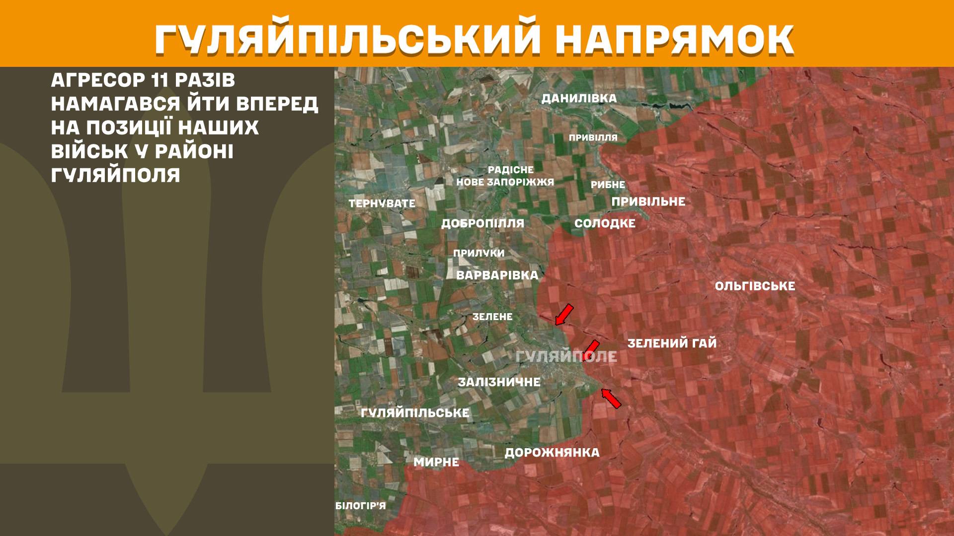 На Оріхівському напрямку наші захисники відбили вісім атак противника у районах Степового, Щербаків, Малих Щербаків, Степногірська та у бік Новоандріївки й Приморського.
