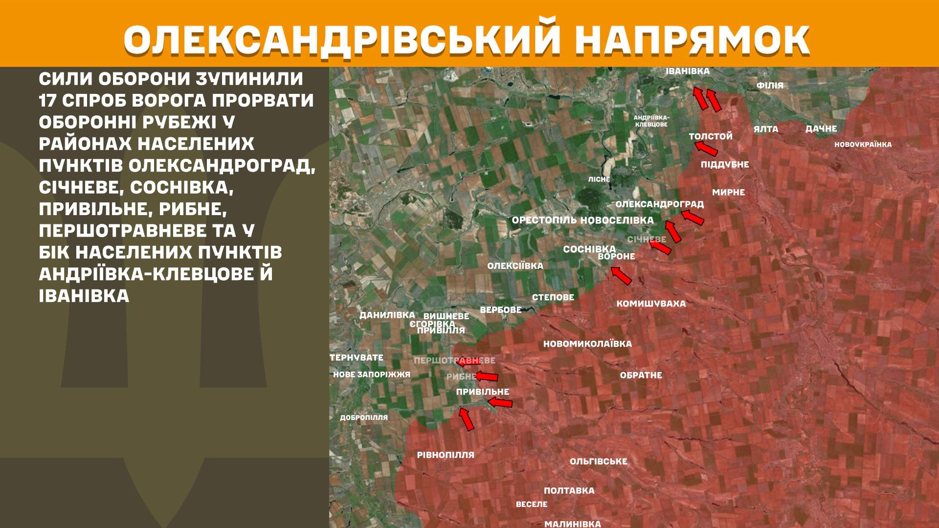 На Олександрівському напрямку Сили оборони зупинили 17 спроб ворога прорвати оборонні рубежі у районах населених пунктів Олександроград, Січневе, Соснівка, Привільне, Рибне, Першотравневе та у бік населених пунктів Андріївка-Клевцове й Іванівка.