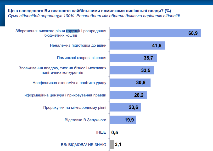 Так, 68,9% опитаних вважають, що збереження високого рівня корупції і розкрадання бюджетних коштів є найбільшою помилкою влади.