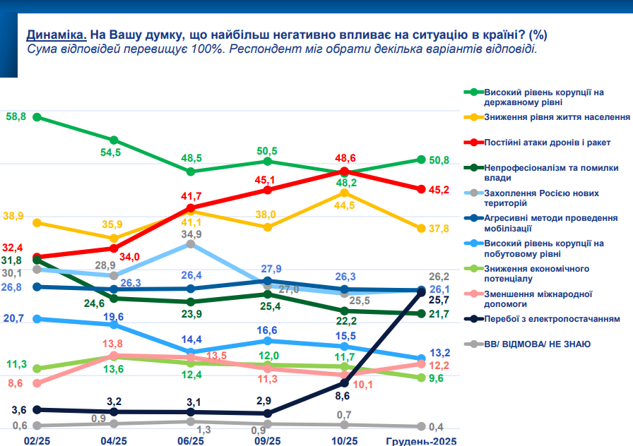 Також українці вважають високий рівень корупції на державному рівні таким, що негативно впливає на ситуацію в країні.