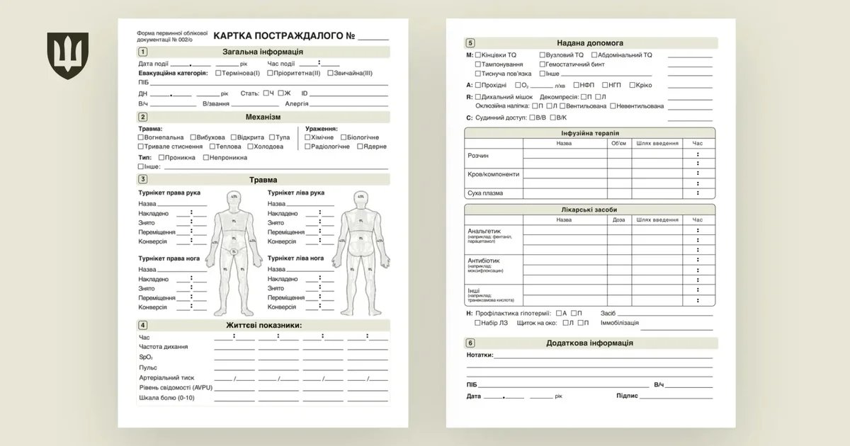 ● Що фіксує: Механізм травми, критичні кровотечі, точний час накладання турнікета та введені знеболювальні чи антибіотики.