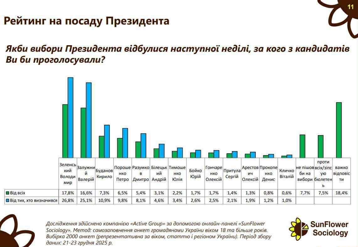 Нагадаємо, подібні результати, як зазначалося раніше, наводить також і компанія SOCIS у своєму грудневому соцопитуванні. До трійки лідерів президентського рейтингу так само входять Зеленський, Залужний і Буданов. У другому турі чинний президент програє як у парі з колишнім головкомом, так і в парі з начальником ГУР.