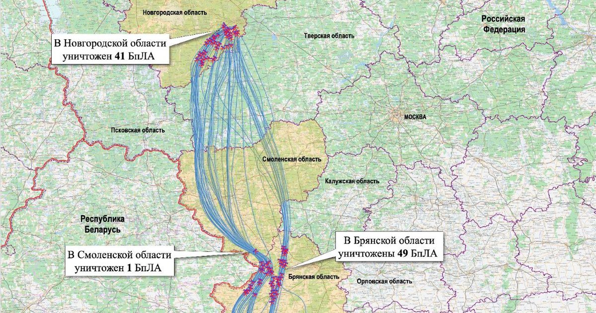 За даними російського відомства, сили ППО нібито знищили 50 безпілотників у Брянській та Смоленській областях і ще 41 - у Новгородській області, які, як стверджують у Москві, прямували до резиденції Путіна поблизу Валдая. Водночас підтверджень цим заявам немає.