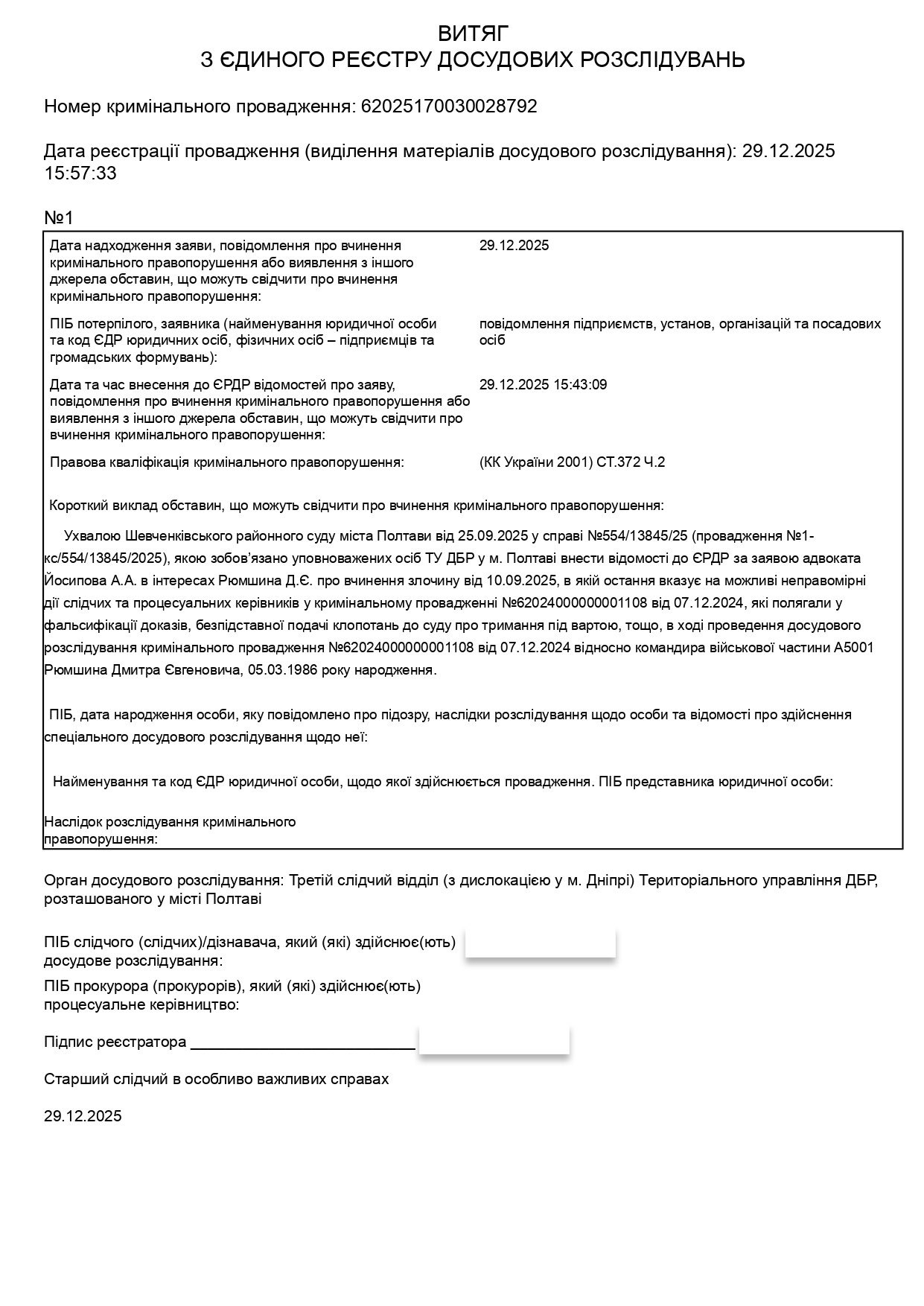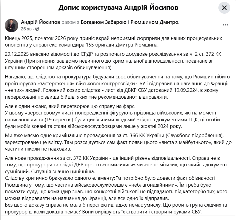 За його словами, 29 грудня 2025 року було внесено відомості до ЄРДР та розпочато досудове розслідування за ч. 2 ст. 372 КК України (Притягнення завідомо невинного до кримінальної відповідальності, поєднане зі штучним створенням доказів обвинувачення).