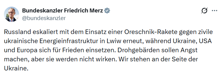 Мерц про удар "Орєшніком": Загрозливі жести РФ не спрацюють, ми на боці України