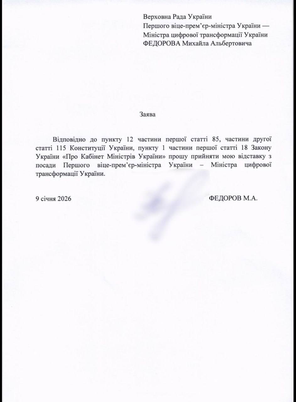 "До Верховної Ради України надійшла заява про відставку Першого віце-прем’єр-міністра України — Міністра цифрової трансформації України Михайла Альбертовича Федорова", - повідомив він.