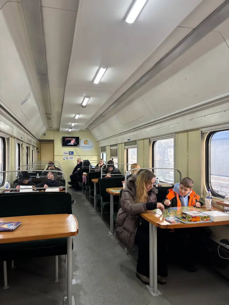 Кожен вагон вміщує до 40 осіб. У них можна зігрітися, зарядити гаджети, підключитися до інтернету через Starlink та випити безкоштовного гарячого чаю.