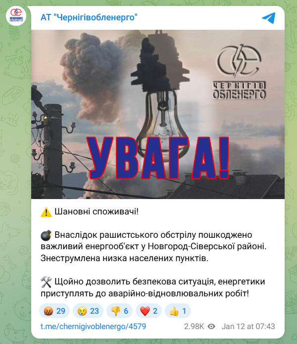 "Внаслідок рашистського обстрілу пошкоджено важливий енергооб'єкт у Новгород-Сіверському районі. Знеструмлена низка населених пунктів", - йдеться в повідомленні.