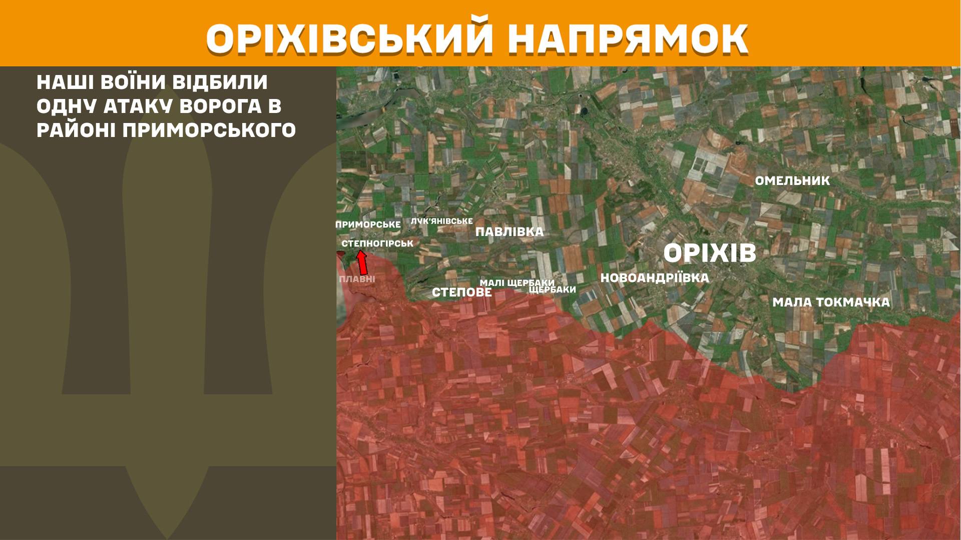 На Оріхівському напрямку минулої доби наші воїни відбили одну атаку ворога в районі Приморського.