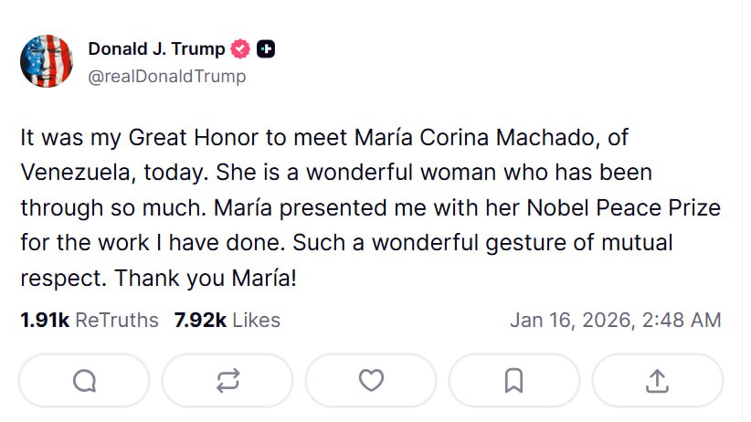 Президент США Дональд Трамп прокоментував те, що лідерка опозиції Венесуели та лауреатка Нобелівської премії миру Марія Коріна Мачадо передала йому свою нагороду, назвавши це "жестом взаємоповаги".