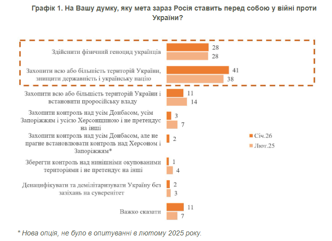 Окремо зазначається, що 2% учасників опитування вважають, що метою Росії є так звана "денацифікація" та "демілітаризація" України без посягання на її суверенітет.
