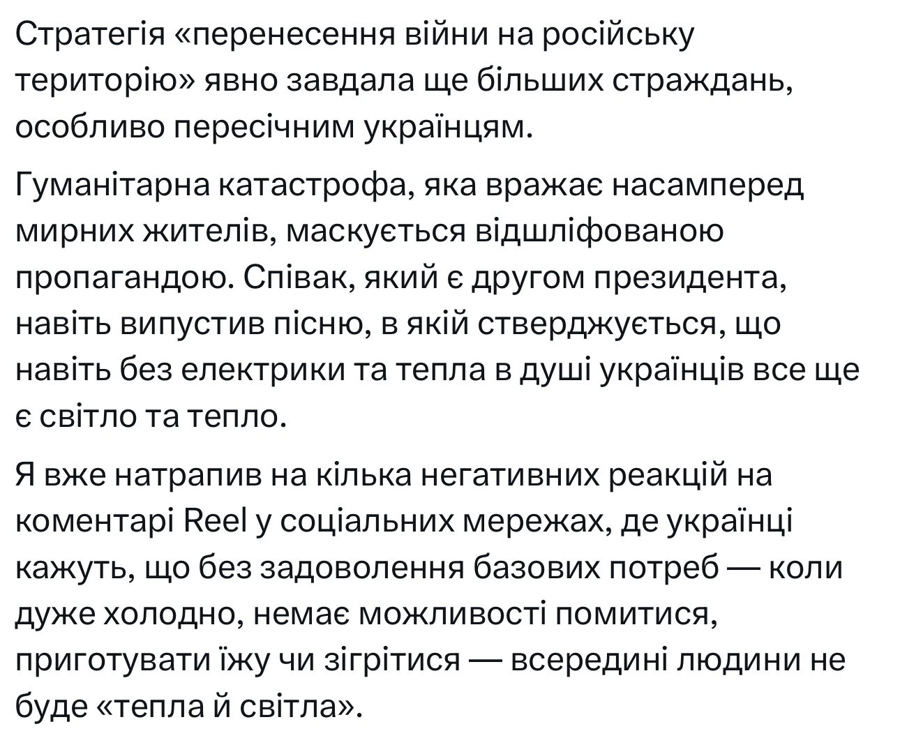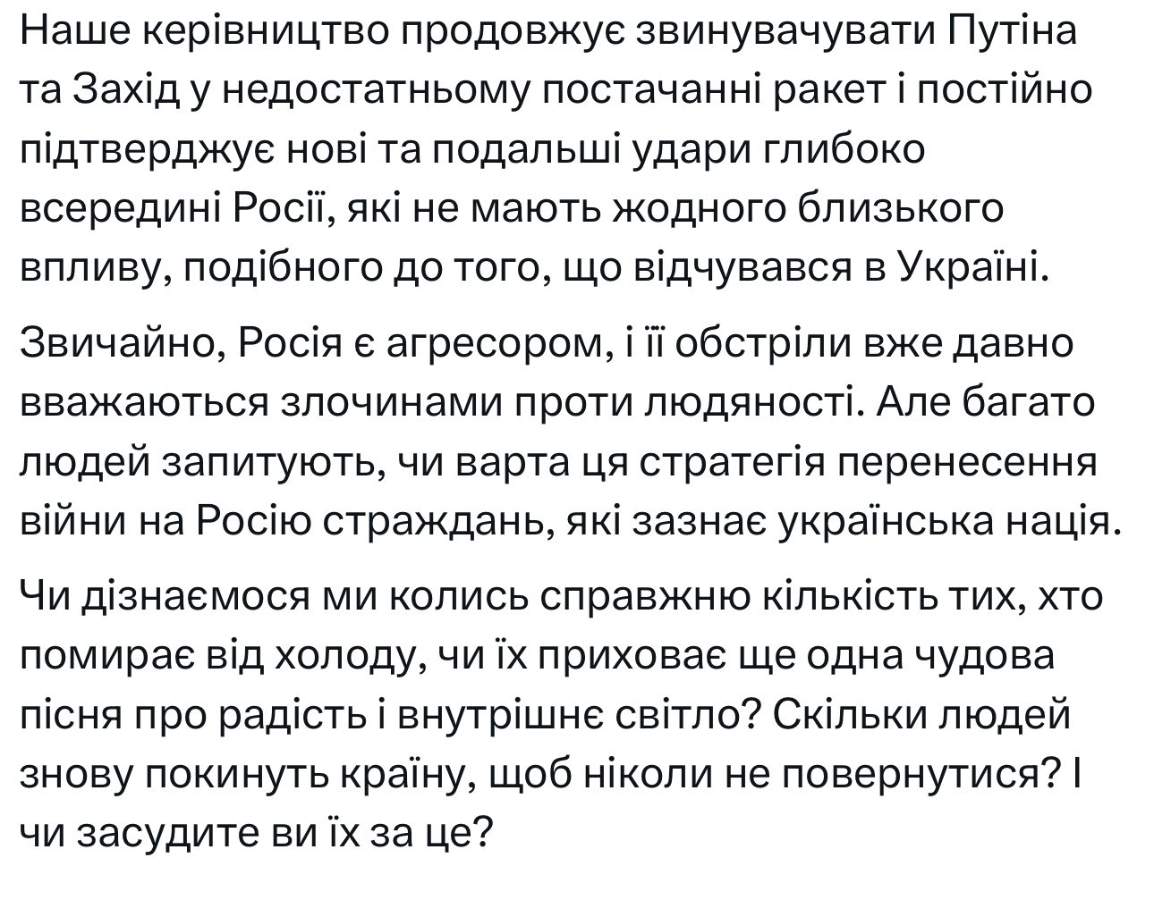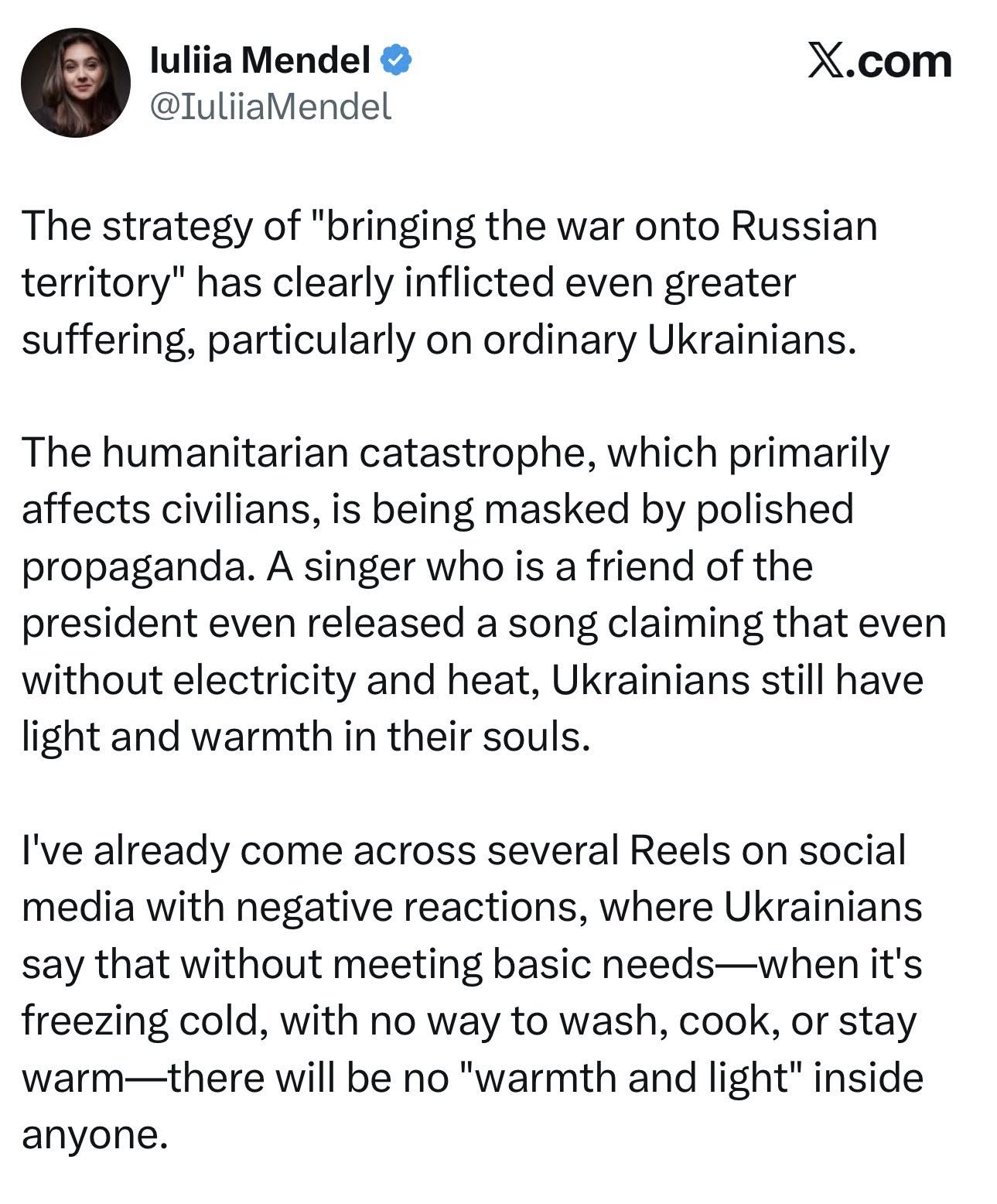 "За її словами, Росія морить мирних мешканців холодом тому що ЗСУ наносять удари по обʼєктах в глибині РФ. Про те, що Росія взагалі-то почала бити по цивільних в Україні ще до того, як в нас зʼявилися можливості відповідати, Мендель звісно не пише", - зазначає Казанський.