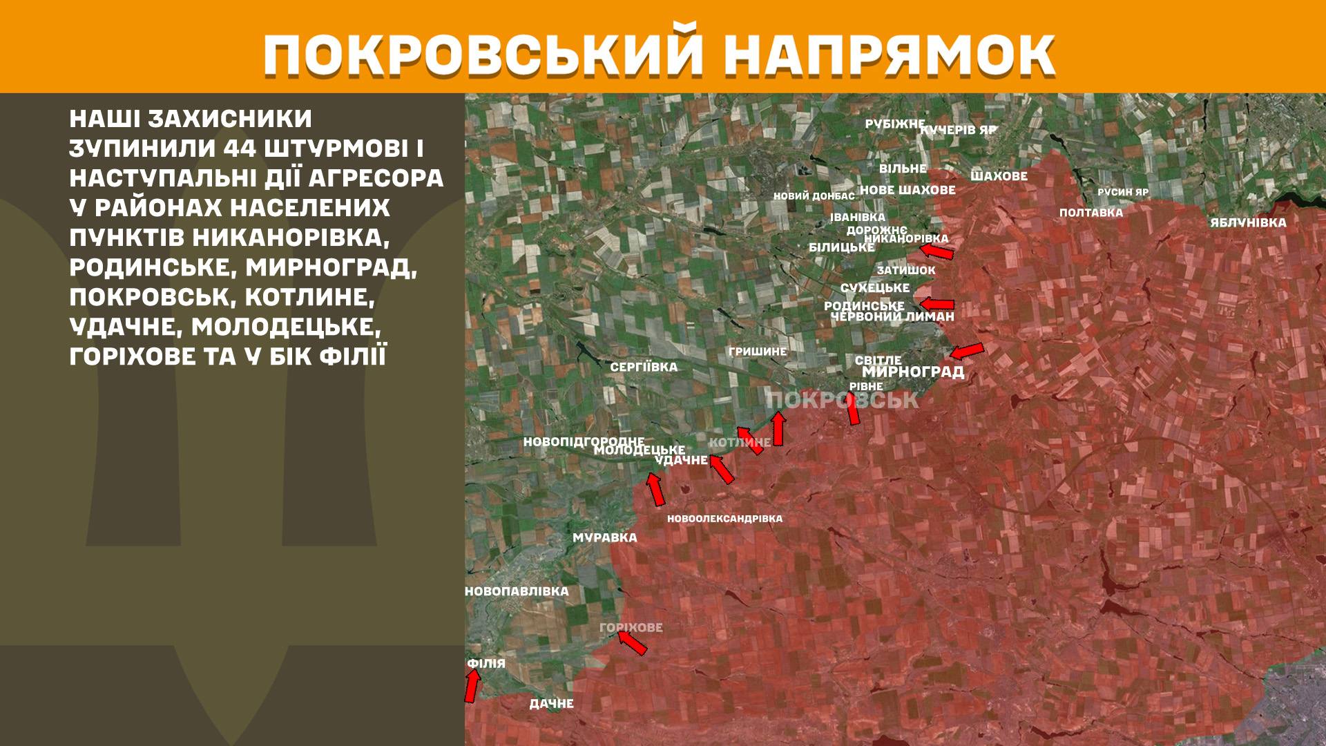"На Покровському напрямку наші захисники зупинили 44 штурмові і наступальні дії агресора у районах населених пунктів Никанорівка, Родинське, Мирноград, Покровськ, Котлине, Удачне, Молодецьке, Горіхове та у бік Філії", - йдеться у повідомленні.