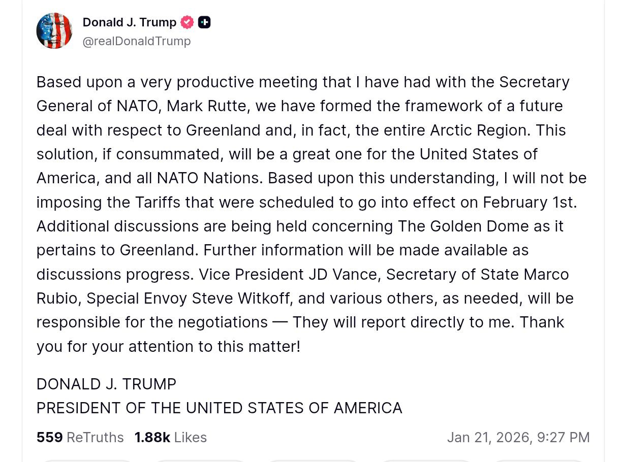 "На основі дуже продуктивної зустрічі, яку я мав із генеральним секретарем НАТО Марком Рютте, ми сформували основу майбутньої угоди щодо Гренландії та, фактично, всього Арктичного регіону. Це рішення, якщо воно буде реалізовано, буде чудовим для Сполучених Штатів Америки та всіх країн НАТО",- написав глава Білого дому.