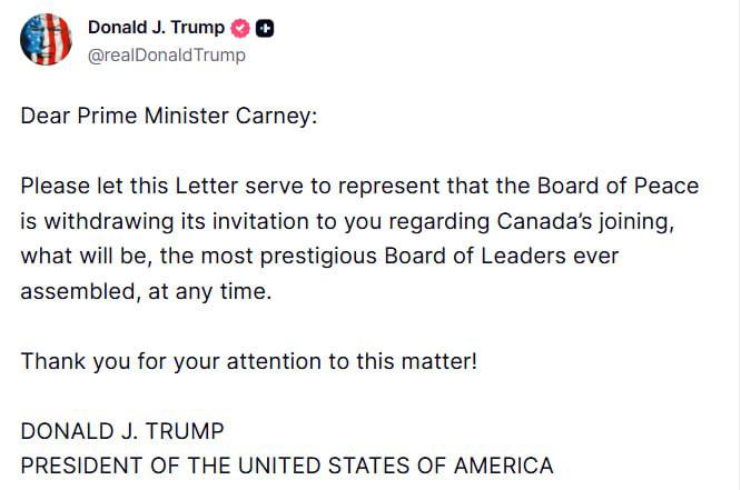 "Шановний прем'єр-міністре Карні! Будь ласка, вважайте цей лист офіційним повідомленням про те, що Рада миру відкликає своє запрошення щодо приєднання Канади до найпрестижнішої Ради лідерів, яка коли-небудь збиралася. Дякуємо за увагу до цього питання!" - йдеться в дописі.