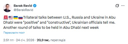 Із посиланням на українських посадовців, він зазначив, що тристоронні переговори між США, Росією та Україною в Абу-Дабі були "позитивними" та "конструктивними"