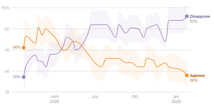 Згідно з результатами опитування, загальний рейтинг схвалення Трампа впав до 38%, що відповідає мінімальному показнику за час його нинішнього перебування на посаді. У попередньому опитуванні, проведеному 12-13 січня, цей показник становив 41%.