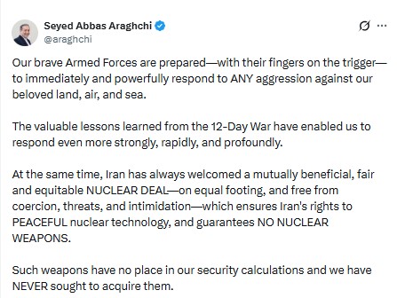 Міністр закордонних справ Ірану Аббас Аракчі заявив, що Тегеран готовий "негайно і рішуче відповісти на будь-яку агресію.