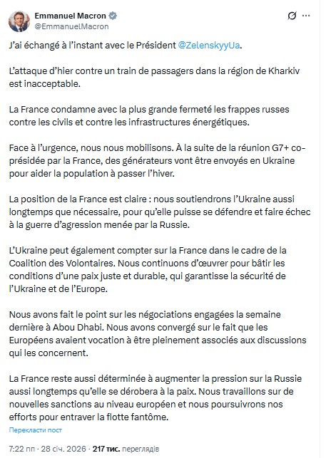 "Ми продовжуємо працювати над створенням умов для справедливого та міцного миру, який гарантує безпеку України та Європи. Ми переглянули переговори, що розпочалися минулого тижня в Абу-Дабі. Ми погодилися, що європейці повинні бути повноцінно залучені до обговорень, які їх стосуються", - сказав французький президент.