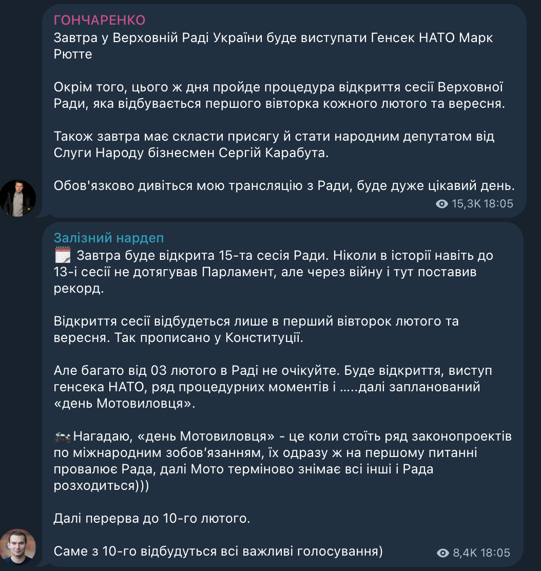"Завтра у Верховній Раді України буде виступати генсек НАТО Марк Рютте", - написав Гончаренко.